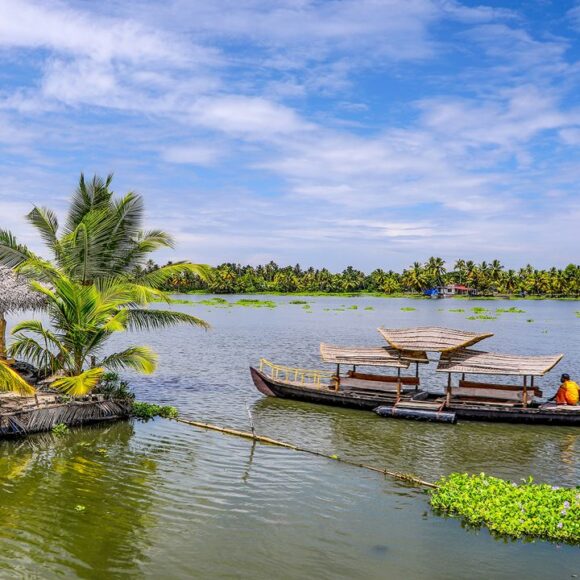 Board a traditional kettuvallam (houseboat) and cruise the serene Kerala backwaters. Overnight on the water under the stars.