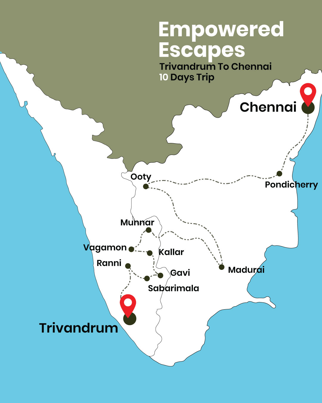 “Empowered Escapes” is more than a journey — it’s a transformative travel experience crafted exclusively for women. From misty meadows to sacred trails, jungle treks to French coastal cafés, this 10-day itinerary blends adventure, reflection, and sisterhood. Discover yourself in the arms of the Western Ghats, through temple towns, forests, and colonial streets, ending with soulful memories on the shores of Pondicherry and Chennai.