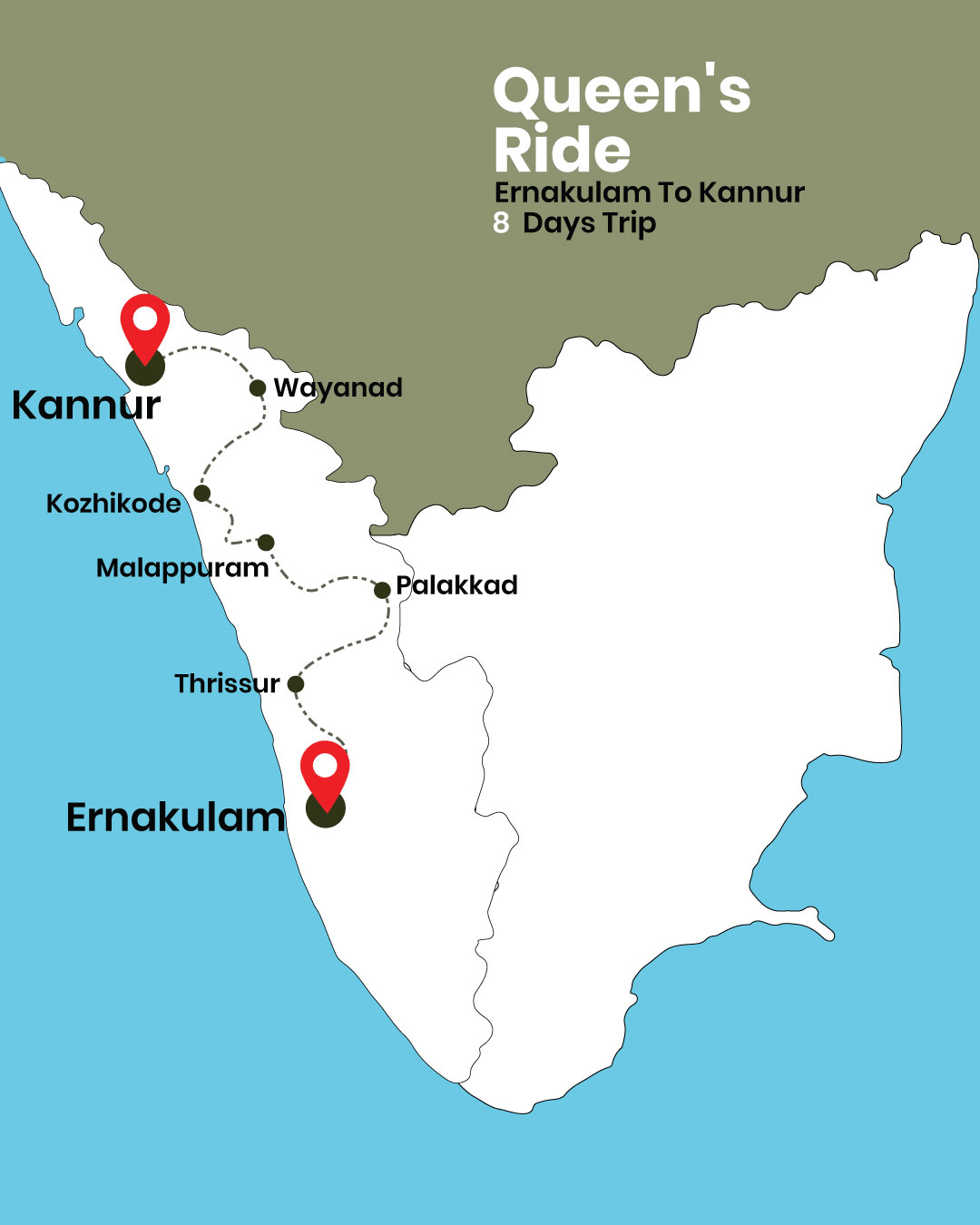 “Queen’s Ride” is a royal trail through Kerala’s vibrant cultural corridor—from the thundering waterfalls of Athirappilly to ancient temples, Ayurvedic centers, paddy fields, caves, waterfalls, and coastal traditions. This 8-day journey combines history, nature, food, and rituals, ending in the coastal charm of Kannur.