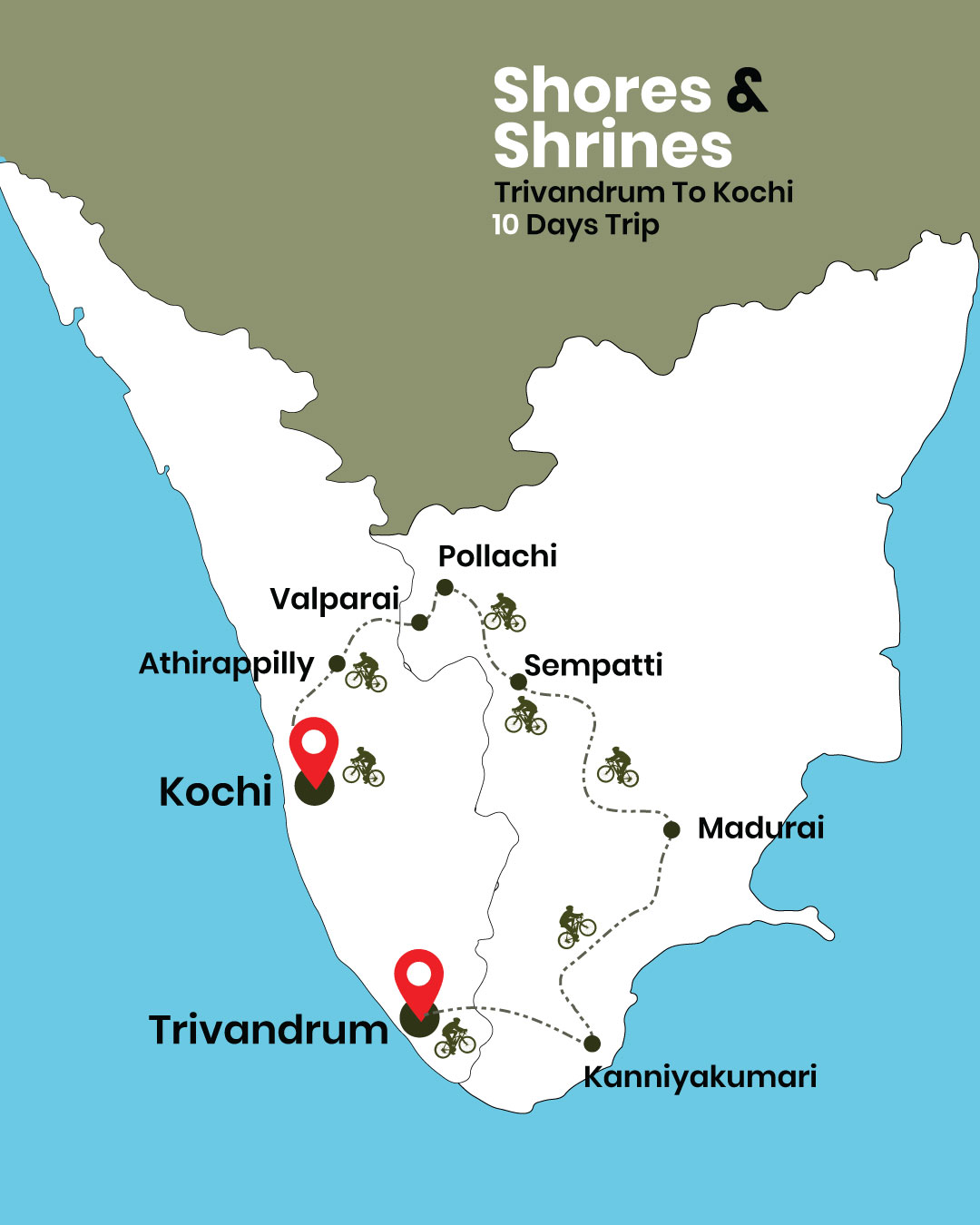Ride through the spiritual heart of South India on a 10-day cycling journey where coastlines, culture, and sacred landscapes meet. Shores & Shrines takes you from the shores of Trivandrum to the historic streets of Kochi, tracing a soul-filled route through ancient temples, rural villages, misty mountains, and lush backwaters.