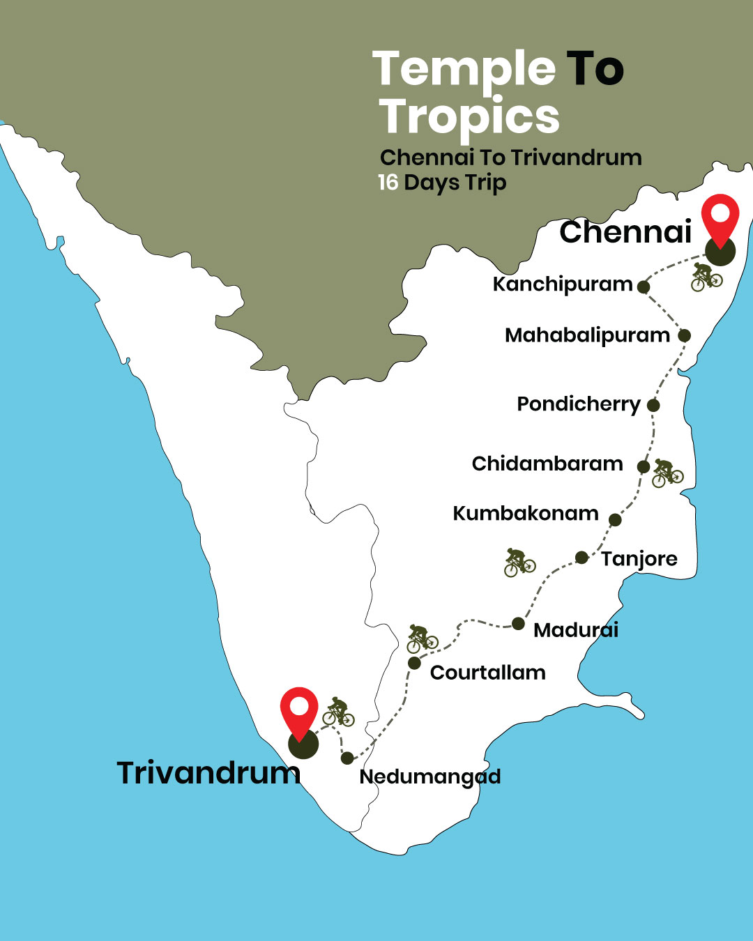 From ancient Dravidian temples to palm-lined tropical coasts, Temple to Tropics is an unforgettable 16-day cycling expedition that takes you deep into the heart of South India. Starting in Chennai and ending in Trivandrum, this immersive coast-to-coast ride weaves through spiritual towns, heritage sites, colorful markets, French colonial streets, and misty Western Ghats.